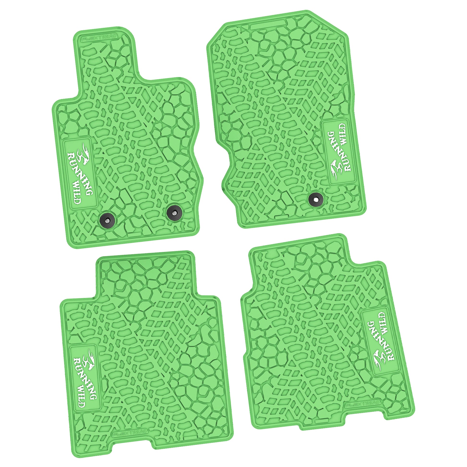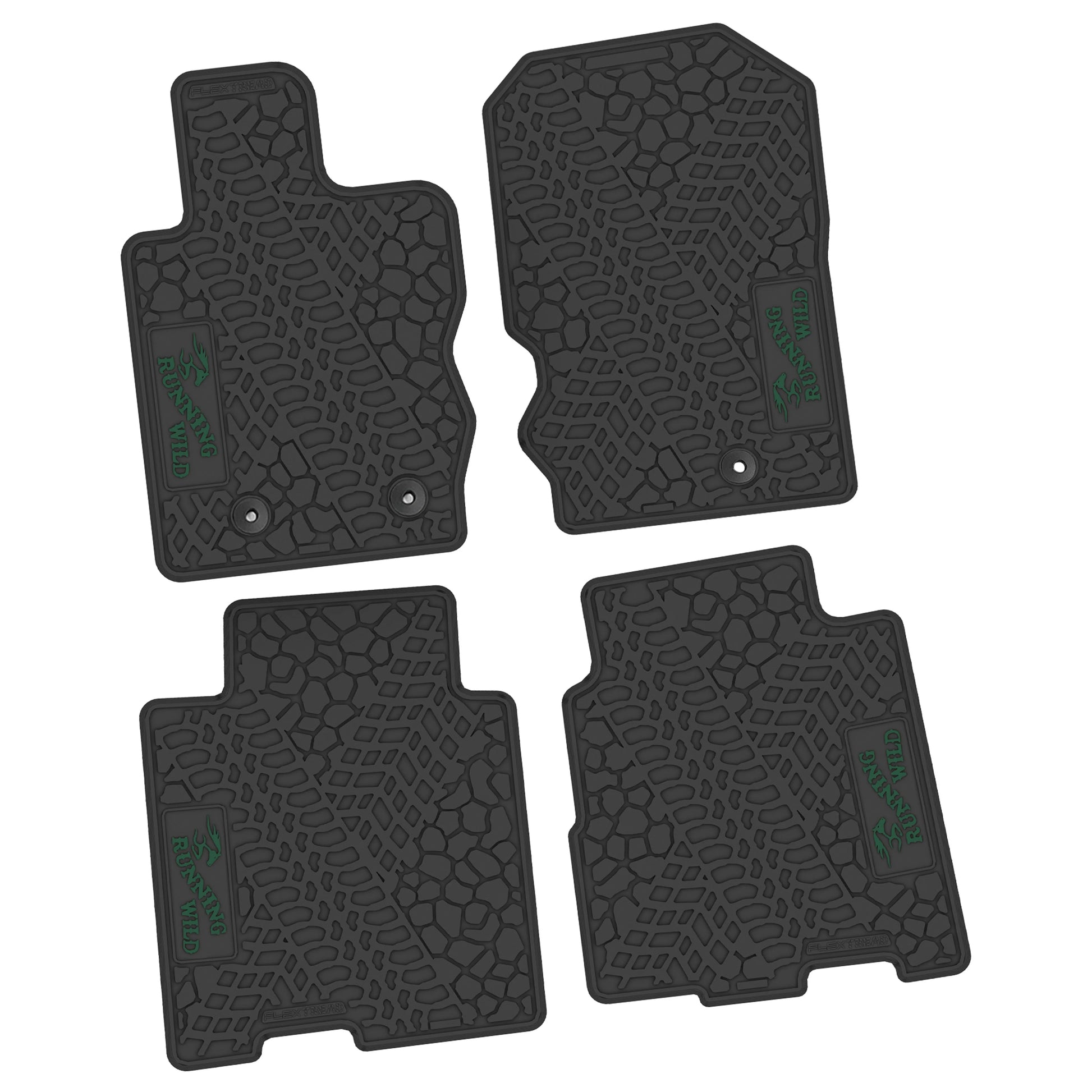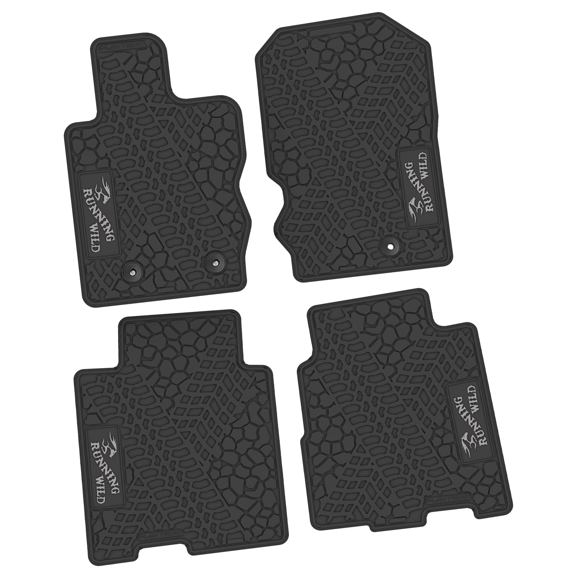These FlexTread custom-fit floor mats are designed specifically for the 2021–2025 Ford Bronco 4-Door and are precision-engineered to match the factory floorpan for an exact, secure fit. This 4-piece floor mat set delivers durable, all-weather protection while maintaining a clean, OEM-style appearance and features the Running Wild logo.